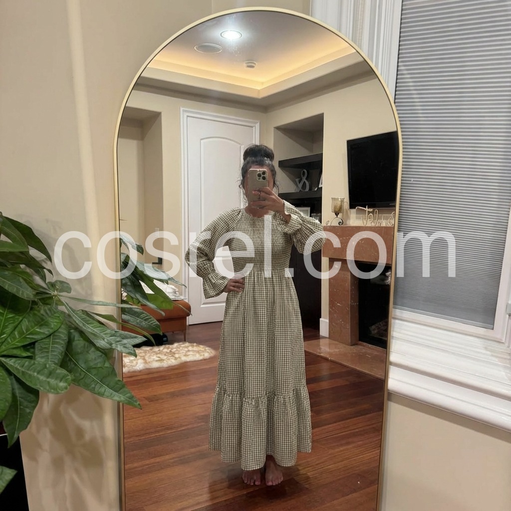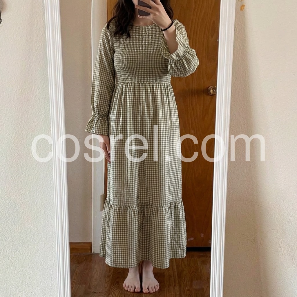 Such a flattering fit! The stretchy top portion makes it fit like a glove, and the skirt flows beautifully when you walk. The green and white check is very subtle and earthy. I paired it with a wicker basket bag just like the model and felt so chic.