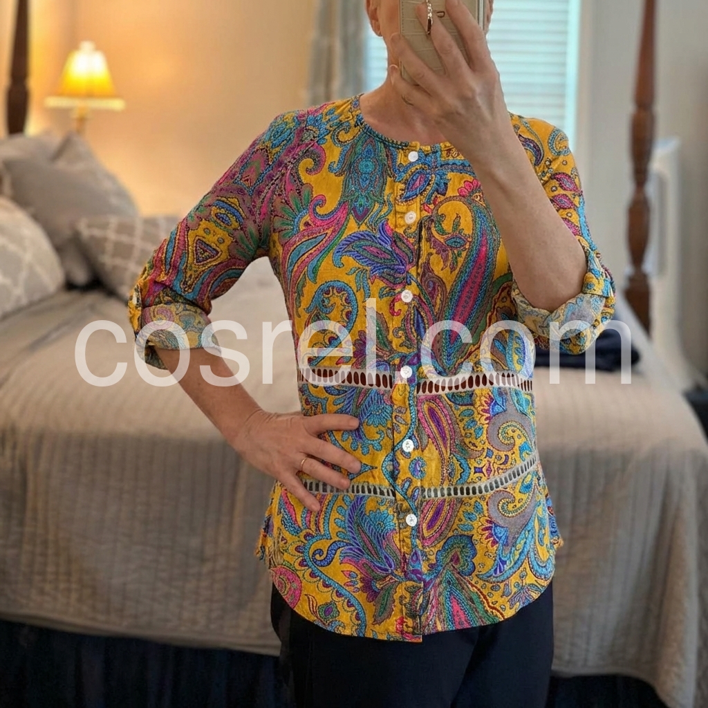 This long-sleeve tunic features a rich yellow base with colorful paisley patterns. The front button design adds vintage charm. Relaxed fit and rolled sleeves for comfort. Perfect for casual wear or bohemian styles. Pair with jeans or leggings for effortless flair.