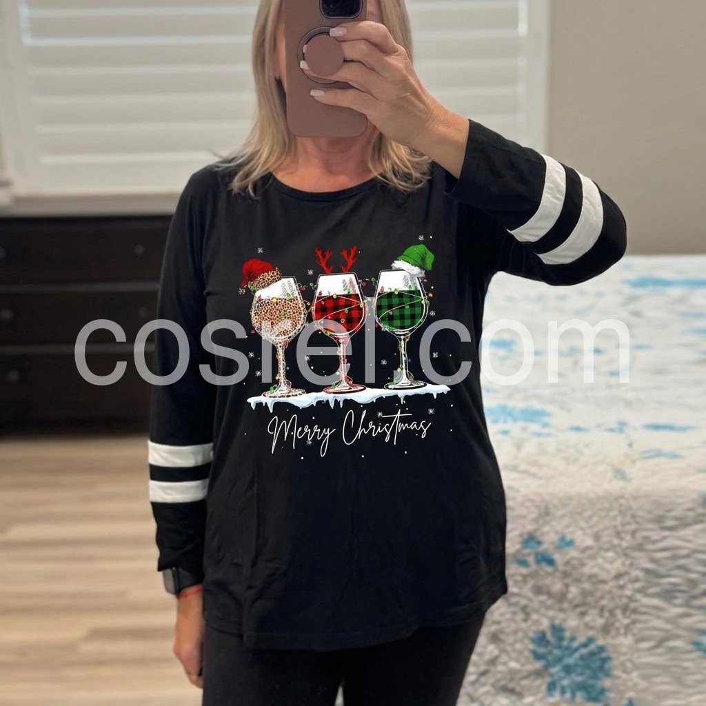 Cute holiday, 3/4 sleeve tunic. Beautiful print with Merry Christmas. Ordered size L. This is a little long for my preference but I can tuck or tie. I am 5’4” and 150.