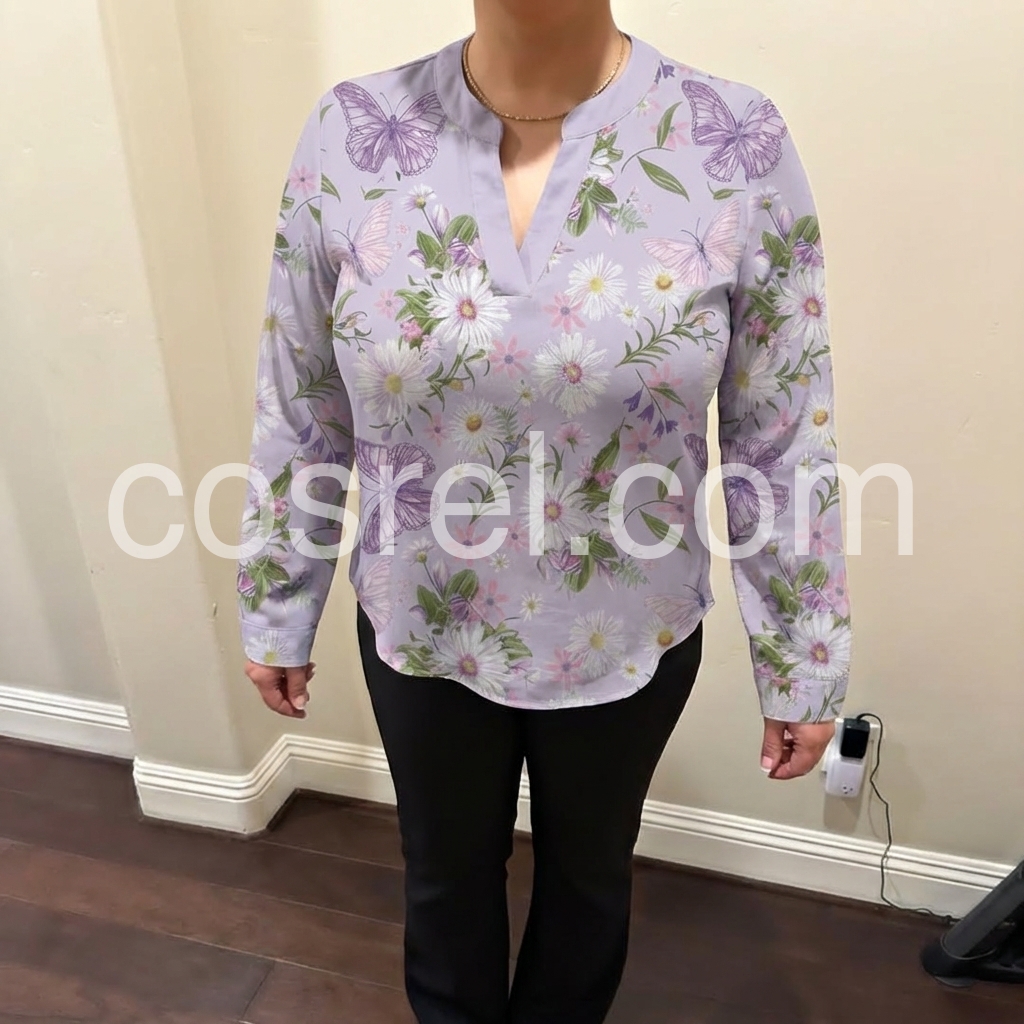 This long-sleeve top features a delicate lavender base with floral and butterfly prints. The keyhole neckline adds a touch of elegance. Lightweight fabric for comfort and breathability. Perfect for spring or casual outings. Pair with jeans or skirts for effortless style.