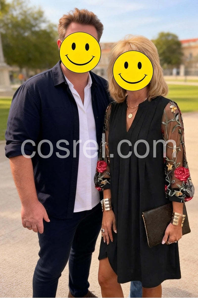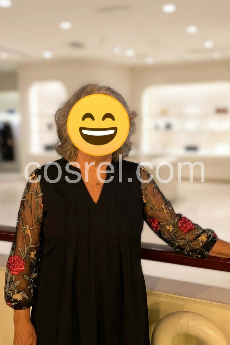 Beautiful dress! I was worried the mesh sleeves might be itchy, but they are incredibly soft and comfortable. The embroidery is stunning in person, with vibrant red roses that really pop. It drapes beautifully and hides my tummy area perfectly.
