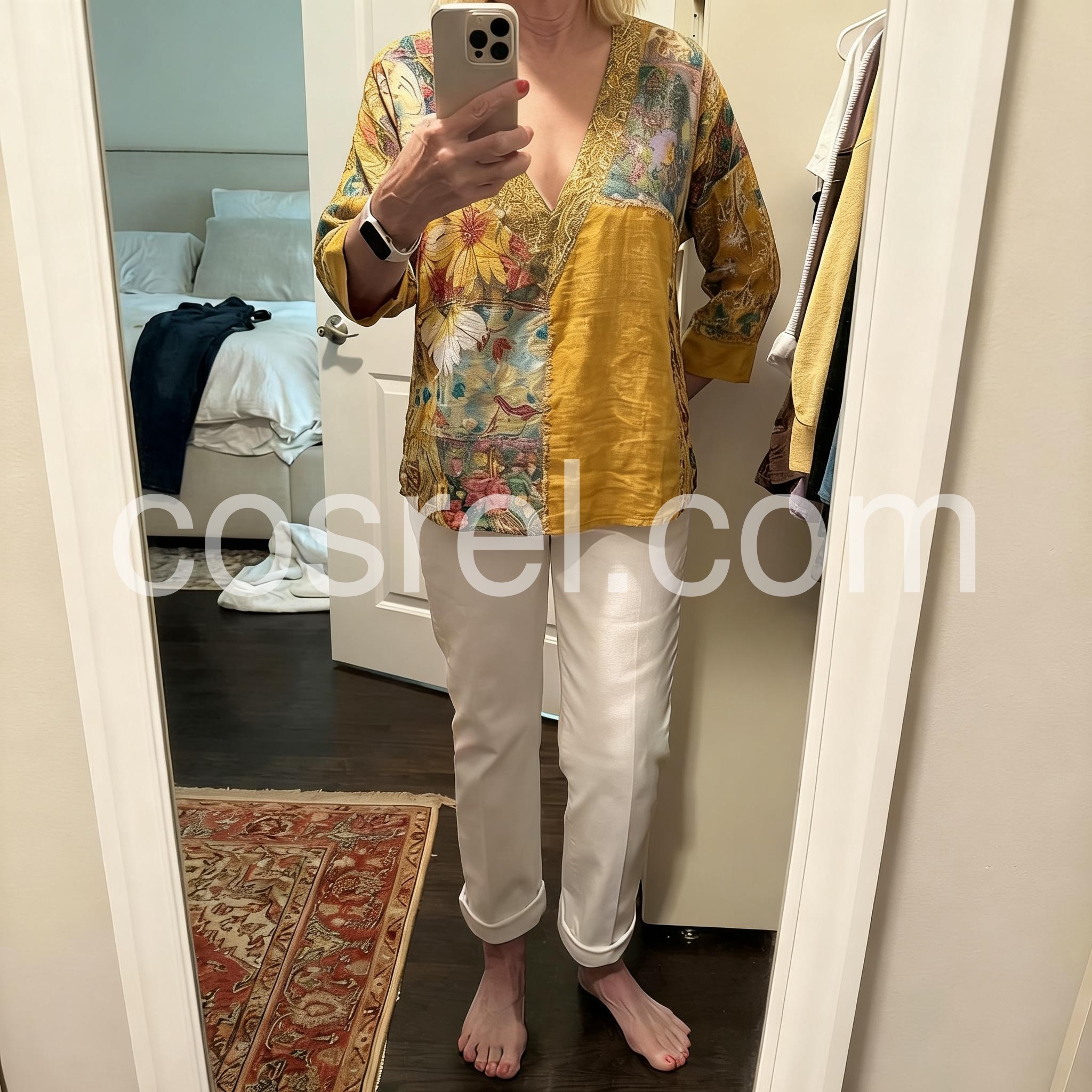 This bohemian top features a bold patchwork design with floral and vintage-inspired prints in warm mustard, blue, and red tones. The deep V-neckline and three-quarter sleeves add flair and comfort. Lightweight fabric ensures ease of movement. Perfect for casual outings or festival wear. Stylish and unique with a free-spirited vibe.