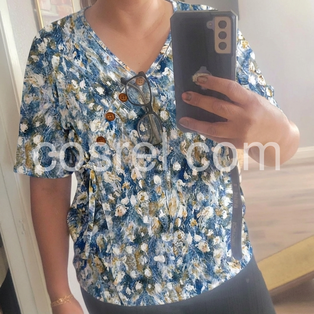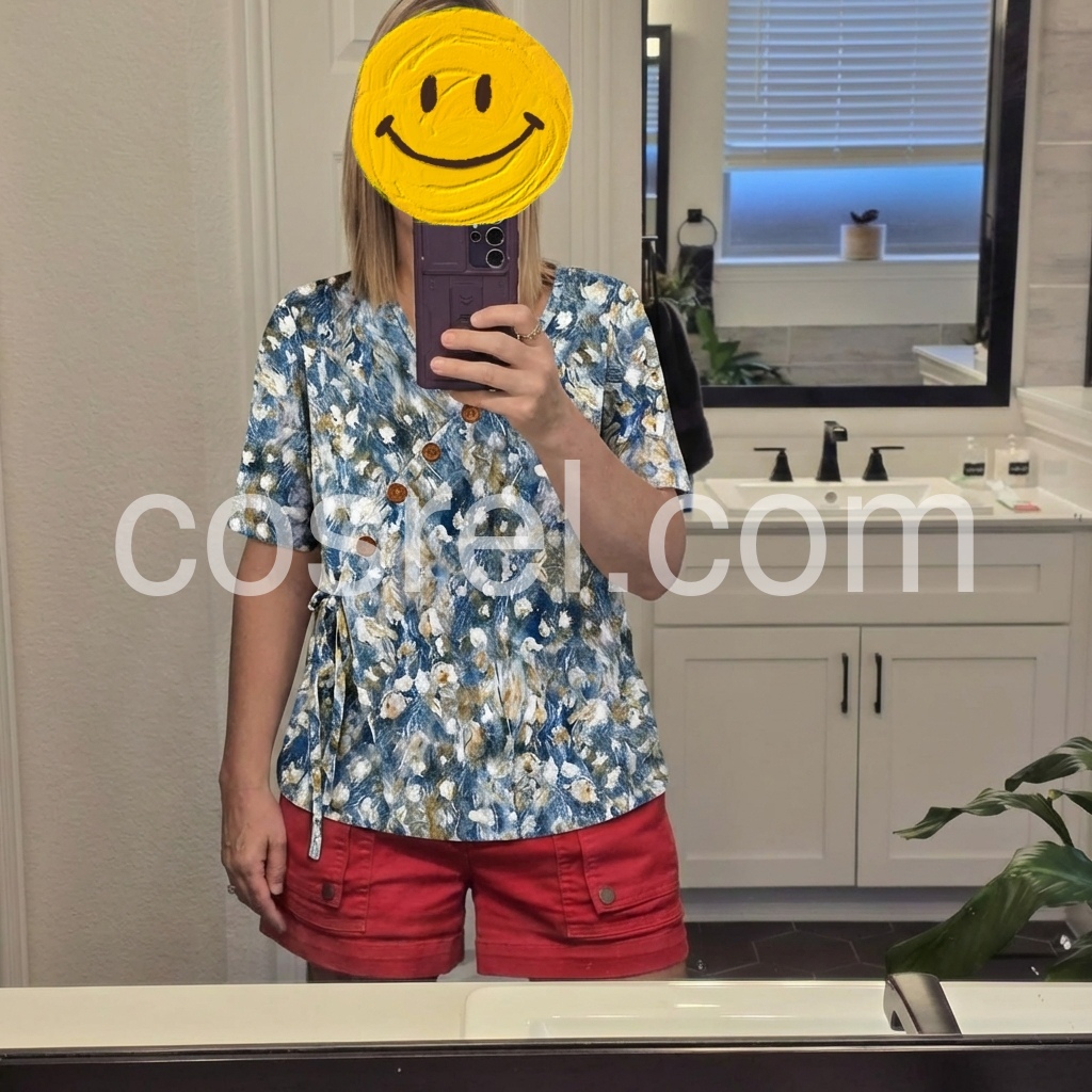I love the diagonal button detail on this top! It adds such a unique touch to a standard floral shirt. The fit is very flattering and hides my mom tummy perfectly. The material is lightweight and breathable for summer. Highly recommend!