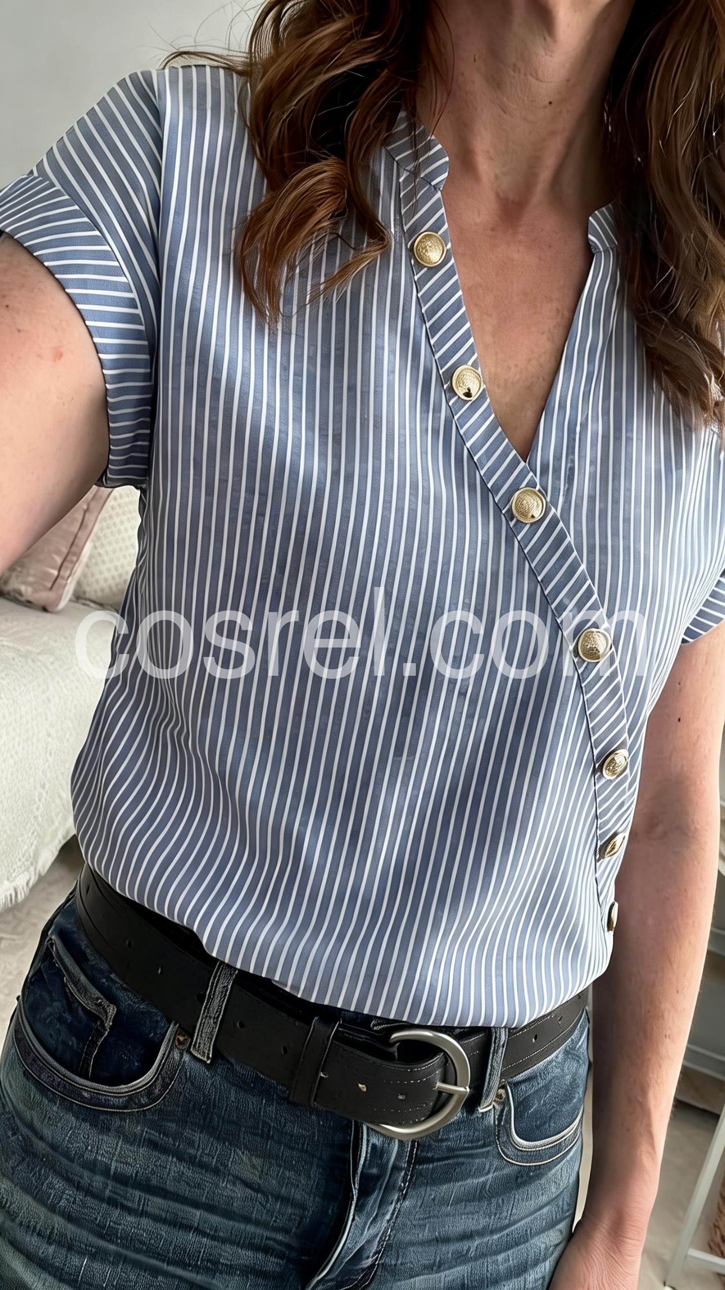 This fitted top features vertical blue and white stripes with a stylish diagonal button closure. Short flutter sleeves and a V-neckline for a feminine touch. Lightweight fabric perfect for warm weather. Ideal for casual outings or everyday wear. Effortlessly chic and comfortable.